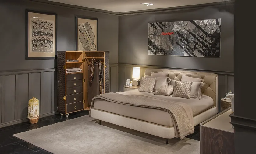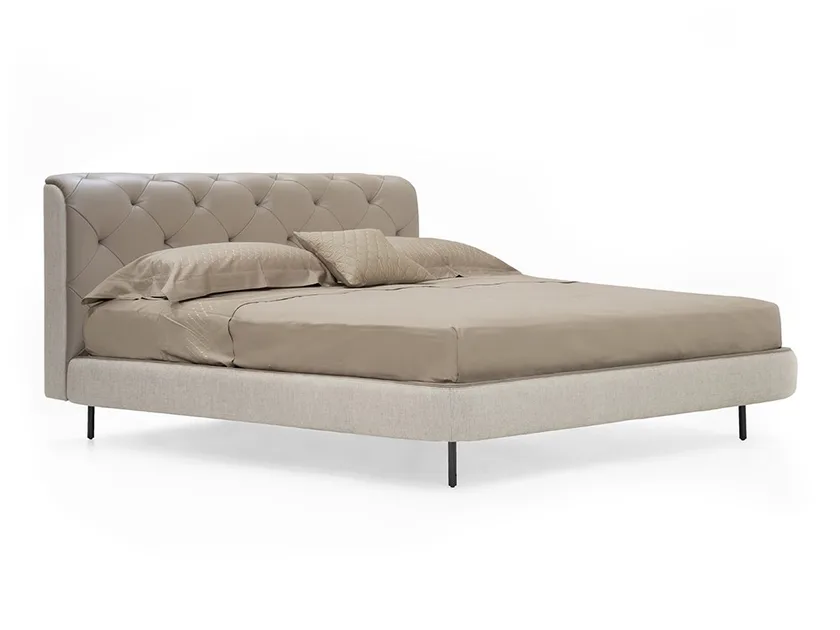 Das Design des Bettes zeichnet sich durch elegante Linien und Liebe zum Detail aus. Das gepolsterte Kopfteil verfügt über ein klassisches Kapitoné-Design, das Tiefe und Textur hinzufügt und die Gesamtästhetik verbessert. Die luxuriöse Lederpolsterung sorgt für ein raffiniertes Aussehen, während die Metallfüße in satiniertem Lichtgold einen zeitgenössischen Akzent setzen. Jedes Element wurde sorgfältig entworfen, um ein zusammenhängendes und elegantes Erscheinungsbild zu schaffen.
