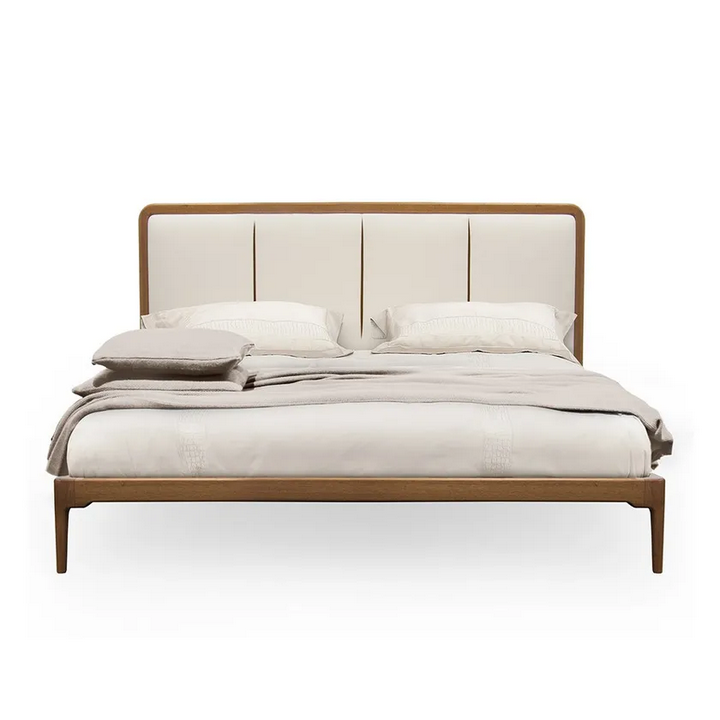 Das Bett besteht aus hochwertigem Mahagoni, das für Haltbarkeit und Stabilität sorgt. Der innere Teil des Kopfteil ist mit luxuriösem Daino-Leder bezogen, das in einem raffinierten Milchton mit ergänzenden Whiskey-VERTICAL-Einsätzen erhältlich ist. Die Oberfläche des Bettes ist mit einer matten Beschichtung versehen, die die natürliche Schönheit des Holzes hervorhebt und zu einem eleganten und zurückhaltenden Look beiträgt. Alle verwendeten Materialien sind umweltfreundlich und nachhaltig und entsprechen internationalen Standards für Qualität und Sicherheit.