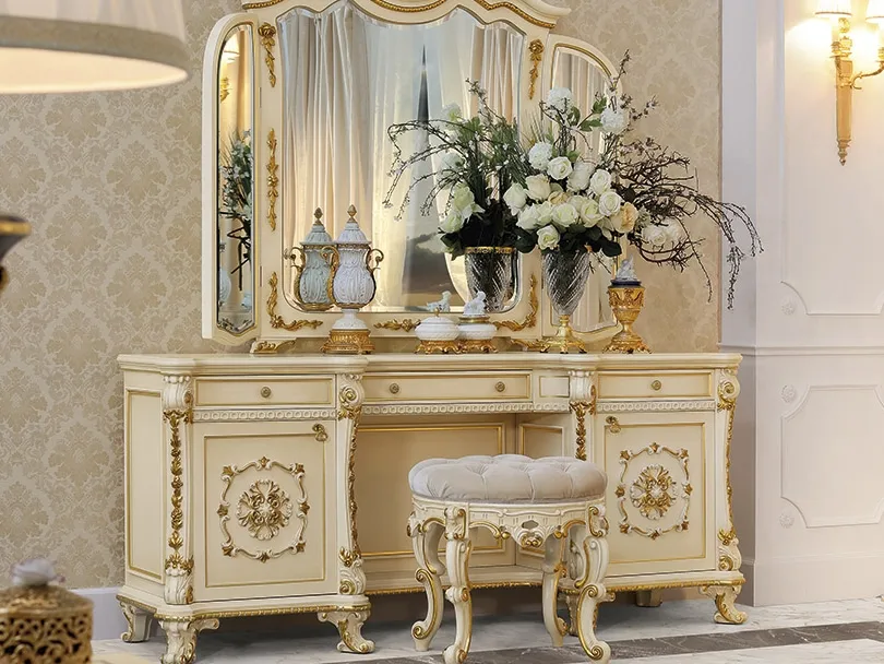 Der Holztisch mit 3 Schubladen und 2 Türen von Modenese Luxury Interiors ist ein atemberaubendes Zentrum für jedes klassische Interieur. Mit seinem eleganten Design kombiniert dieser Schminktisch Funktionalität und Stil und bietet großzügigen Stauraum mit drei geräumigen Schubladen und zwei Türen. Die Imperial-Kollektion spiegelt ein Engagement für zeitlose Traditionen und ein Gefühl der Stabilität wider, was ihn zu einer perfekten Ergänzung sowohl für moderne als auch für traditionelle Räume macht. Seine Handwerkskunst und Liebe zum Detail sorgen dafür, dass er in jedem Raum hervorsticht.