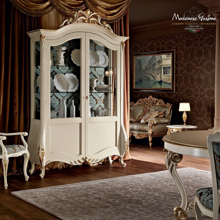 Der Display Cabinet mit 4 Türen aus der Villa Venezia Kollektion von Modenese Luxury Interiors verkörpert Eleganz und Raffinesse. Hergestellt aus massivem Holz, hebt sich dieses exquisite Stück durch seine prächtigen Schnitzereien und handgefertigten Dekorationen hervor. Perfekt gestaltet, um Ihre wertvollen Besitztümer zu präsentieren, verfügt es über vier geräumige Türen, die ausreichend Stauraum bieten und Ihre Wohnkultur aufwerten. Der zeitlose klassische Stil, kombiniert mit der reichen venezianischen Tradition, macht diesen Schrank zu einer atemberaubenden Ergänzung für jedes Interieur.