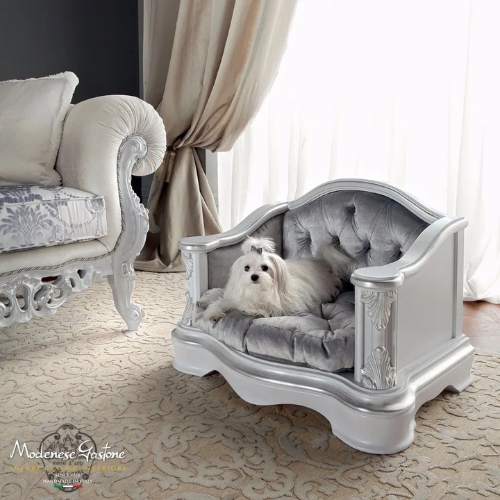 Das Holzkissen für Haustiere weist ein raffiniertes Design mit komplizierten Details auf. Die barock inspirierten Elemente, kombiniert mit modernem Design, ergeben eine einzigartige Silhouette, die in jedem Raum auffällt. Die sorgfältige Aufmerksamkeit für Details in der Verarbeitung und den verwendeten Materialien trägt zu seinem Gesamtscharm und Luxus bei.