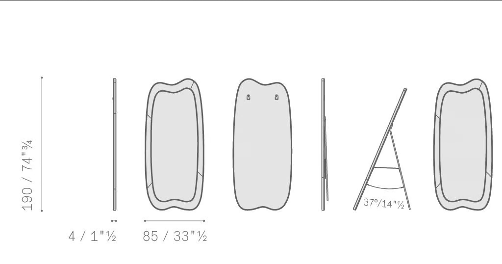 Der SQUASH Spiegel verfügt nicht über integrierte Beleuchtung oder fortschrittliche Mechanismen, sondern konzentriert sich stattdessen auf ein minimalistisches Design, das seine elegante Form betont. Dennoch gewährleistet seine robuste Konstruktion Stabilität, ob an der Wand montiert oder freistehend. Die Abmessungen sind durchdacht gestaltet, um sich in verschiedene Innenräume einzufügen und eine einfache Integration in die bestehende Dekoration zu ermöglichen.