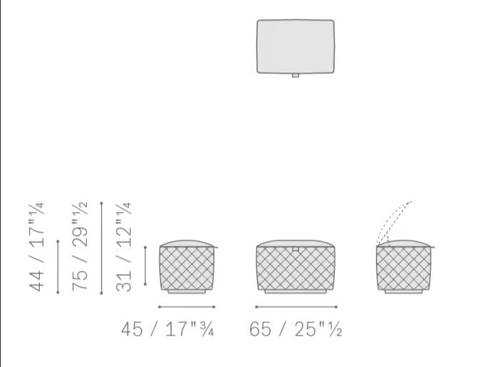 Der Pouf verfügt über raffinierte Mechanismen, die seine Funktionalität erhöhen, wie das innovative Verriegelungssystem für das Stauraumfach. Diese Liebe zum Detail sorgt dafür, dass jeder Aspekt des Designs einen Zweck erfüllt und Bequemlichkeit bietet, ohne den Stil zu beeinträchtigen.