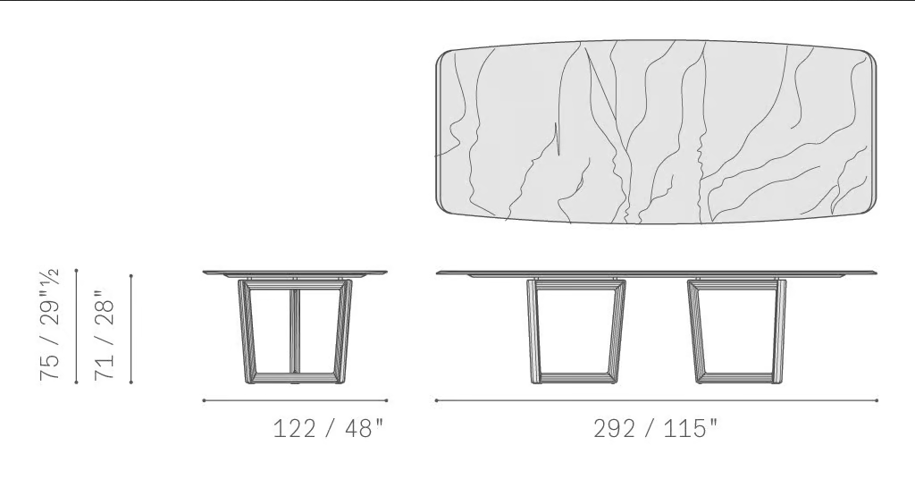 Der Tisch besteht aus einer einzigen Platte aus hochwertigem trompetenförmigem Marmor und ist in exquisiten Oberflächen erhältlich, darunter Calacatta Oro und Fior di Pesco. Die Marmoroberfläche ist entweder mit einer polierten Oberfläche für erhöhte Haltbarkeit oder mit einer semi-polierten Oberfläche behandelt, die eine natürlichere Ästhetik bietet. Die Beine bestehen aus massivem Eschenholz oder Canaletto-Walnuss und bieten eine stabile und elegante Basis. Alle verwendeten Materialien sind umweltfreundlich und entsprechen internationalen Nachhaltigkeitsstandards.