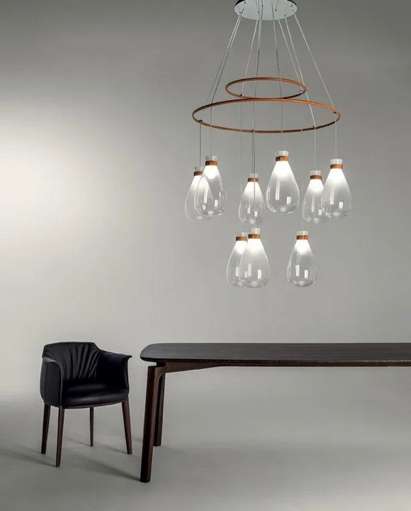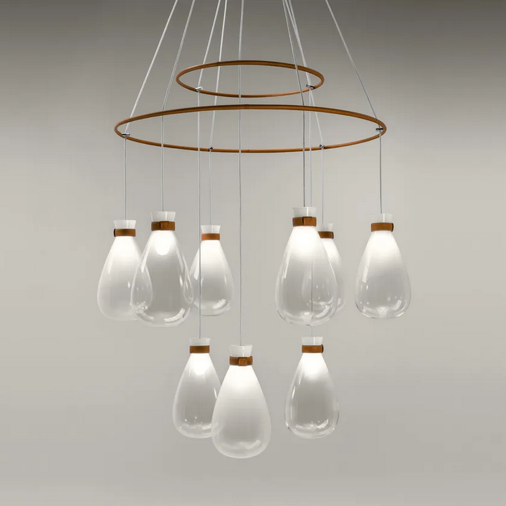 Der Blown Glass Chandelier Soffi besteht aus einer Komposition von komplizierten Elementen, darunter zwei konzentrische Ringe aus luxuriösem Leder, die insgesamt neun mittelgroße Glaslichter beherbergen. Das Design des Kronleuchters ermöglicht kreative Konfigurationen mit Optionen für verschiedene Anordnungen, die den individuellen Vorlieben und Raumanforderungen gerecht werden.