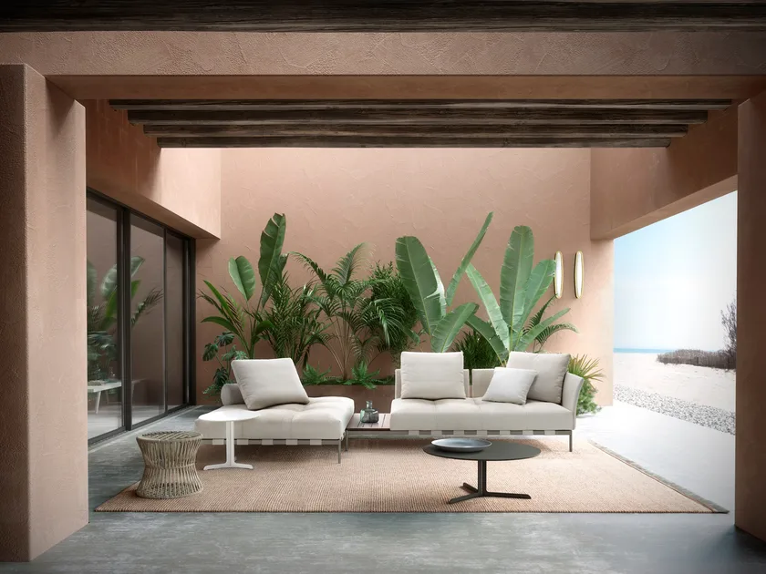 Das Pixel Light Outdoor Sofa ist mit funktionalen Aspekten im Hinterkopf entworfen. Es bietet anpassbare Elemente wie klassische Armlehnen oder niedrigere gepolsterte Armlehnen für zusätzlichen Komfort. Die Einführung eines niedrigen Tischelements aus natürlich lackiertem Iroko-Holz erhöht die Vielseitigkeit des Sofas und ermöglicht eine Vielzahl von Verwendungen und Anordnungen. Darüber hinaus sorgt die innovative Sitzkonstruktionstechnik für eine effiziente Ableitung von überschüssigem Wasser, wodurch das Sofa trocken und komfortabel bleibt.