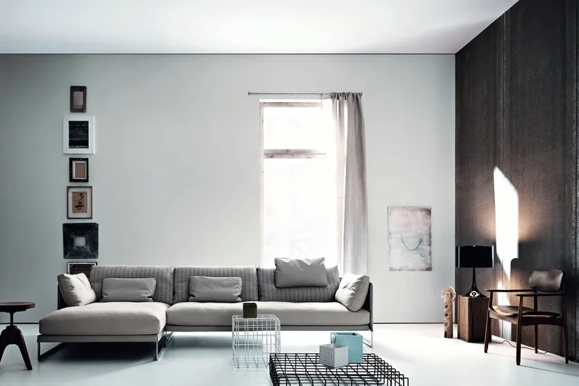 Das Sectional Fabric Sofa Livingston von SABA ITALIA wurde entwickelt, um moderne Wohnräume mit seiner innovativen verstellbaren Rückenlehne zu bereichern, die sich leicht in einen bequemen Platz verwandelt. Dieses Sofa hebt sich durch seine einzigartige Silhouette und die plüschigen Kissen hervor, die zahlreiche Konfigurationen ermöglichen, um jedem Raum gerecht zu werden. Die Kombination aus einem schlanken Metallgestell und großzügiger Polsterung bietet sowohl Komfort als auch Stil und macht es perfekt für zeitgenössische Innenräume.