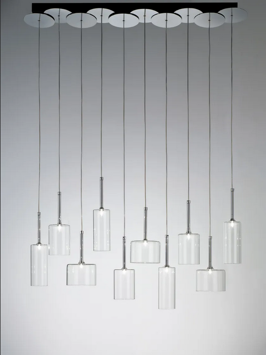 Die Stained Glass Pendant Lamp Spillray ist aus hochwertigen Glas und Metall gefertigt und exemplifiziert Haltbarkeit und Raffinesse. Das Chrom-Finish der Lampe verleiht nicht nur einen Hauch von modernem Eleganz, sondern sorgt auch für Langlebigkeit. Die Verwendung umweltfreundlicher Materialien entspricht internationalen Nachhaltigkeitsstandards und macht diese Lampe zu einer umweltbewussten Wahl für die Beleuchtung. Die Glasschirme sind in klaren oder farbigen Optionen erhältlich, was eine Anpassung an Ihren persönlichen Stil und Ihre Einrichtung ermöglicht.