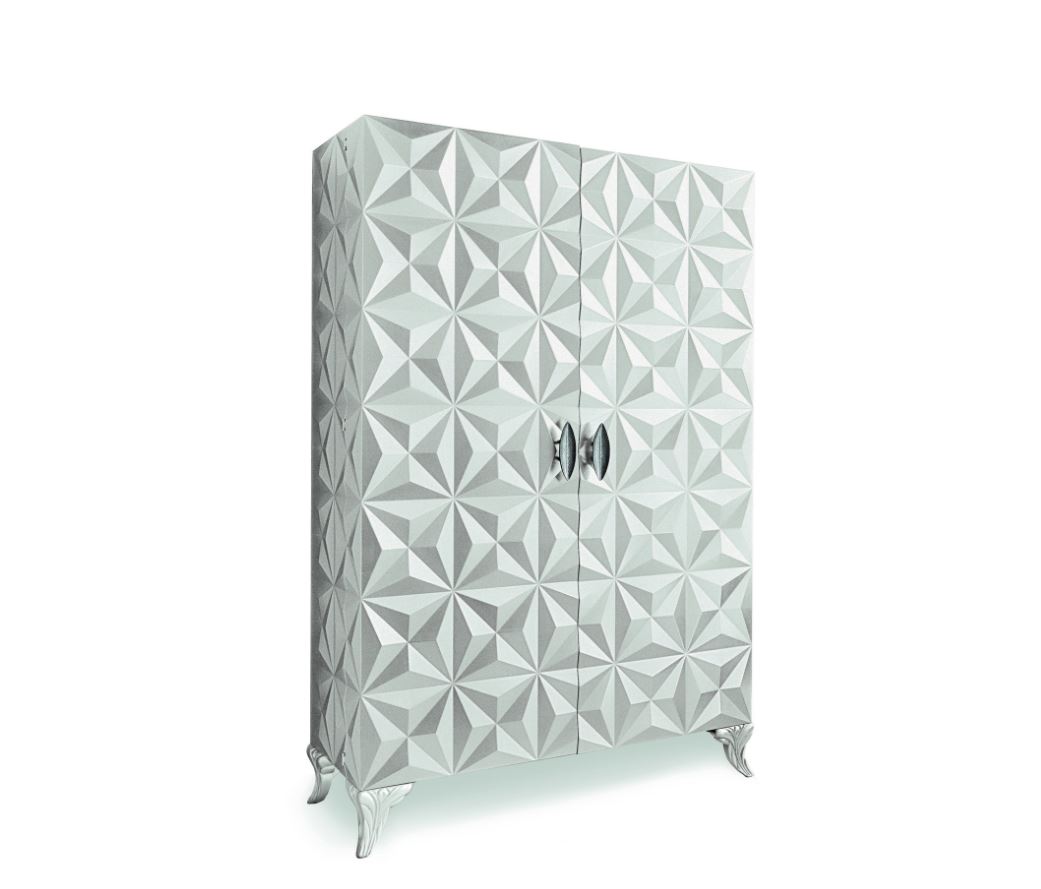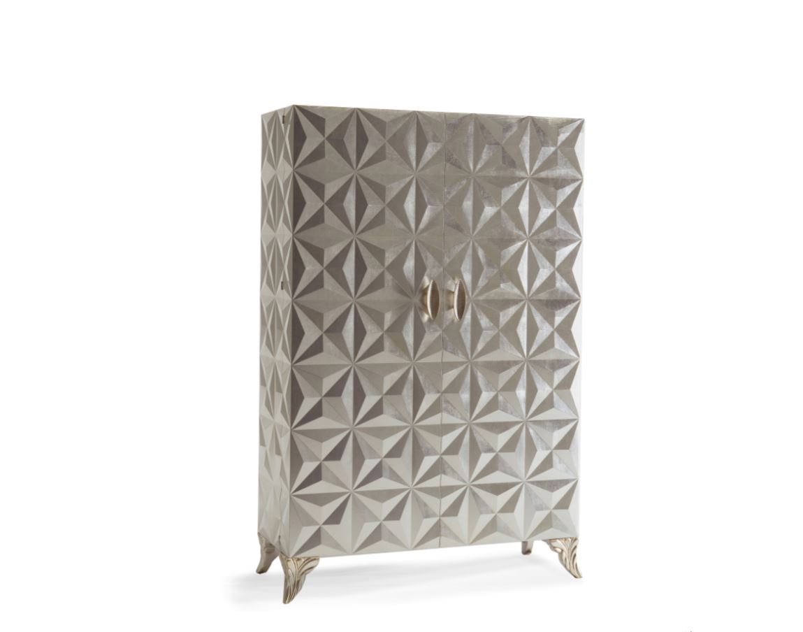 Der Diamond-Schrank zeigt ein raffiniertes Design, das durch seine schlanke Silhouette und die Liebe zum Detail gekennzeichnet ist. Dekorative Elemente, wie die komplizierte Silberblattoberfläche und die durchdacht gestalteten Fächer, erhöhen seine ästhetische Anziehungskraft. Der Gesamteindruck ist anspruchsvoll und macht ihn zu einem Statement-Stück, das das Auge anzieht und gleichzeitig wichtige Aufbewahrungslösungen bietet.