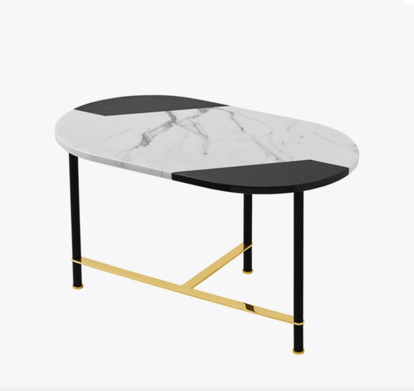 Das Design des COOKIES Kaffeetischs betont klare Linien und eine ovale Silhouette, die Sophistication ausstrahlt. Die Liebe zum Detail zeigt sich in den komplizierten Intarsien und der Wahl der Materialien, die zusammen einen kohärenten und einladenden Look schaffen. Die Struktur des Tisches, gefertigt aus schwarz handgebürstetem anodisiertem Aluminium und hellem Messing, fügt einen industriellen Touch hinzu, der die Wärme der Holz- und Marmoberflächen ergänzt und sicherstellt, dass er aus allen Blickwinkeln Bewunderung erregt.