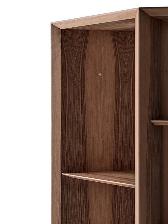 Dieses Bücherregal wird aus hochwertigem Holz, speziell Frisè Walnuss, hergestellt, das für seine reiche Textur und Haltbarkeit bekannt ist. Die Teile aus satiniertem Messing verleihen einen raffinierten Touch und sorgen gleichzeitig für Langlebigkeit. Die Essence-Oberfläche hebt die natürliche Schönheit der Walnuss hervor und verleiht ihr einen sanften Glanz, der ihren organischen Look ergänzt. Alle Materialien sind nachhaltig beschafft und entsprechen internationalen Zertifizierungsstandards, was ökologische Verantwortung und Umweltfreundlichkeit gewährleistet.
