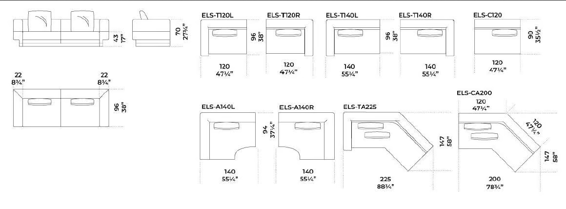 Das Elissa Modular Sectional Sofa ist in verschiedenen Abmessungen erhältlich, um unterschiedlichen Raumgrößen und -layouts gerecht zu werden. Jedes Modul kann auf vielfältige Weise kombiniert werden, um sowohl großzügige Wohnräume als auch kompaktere Umgebungen zu bedienen. Das durchdachte Design sorgt dafür, dass das Sofa nicht nur großartig aussieht, sondern sich auch nahtlos in Ihr Zuhause einfügt und jahrelang Komfort und Stil bietet.
