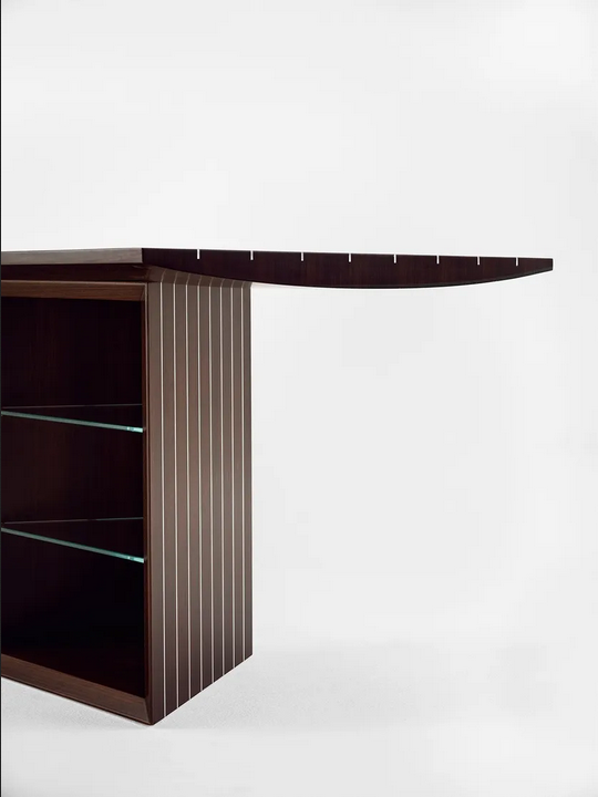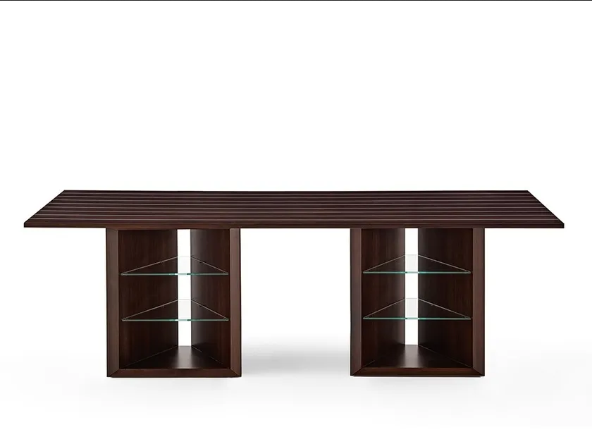 Der rechteckige Schreibtisch aus Rosenholz ist mit Praktikabilität im Hinterkopf entworfen. Er umfasst zwei interne Regale, die jeweils aus 8 mm dickem, extraleichtem, gehärtetem Glas gefertigt sind, um praktischen Stauraum für Büromaterialien und Dokumente zu bieten. Die Anordnung des Schreibtischs ist für eine effiziente Organisation optimiert, sodass Benutzer ihren Arbeitsplatz ordentlich halten können. Darüber hinaus können integrierte versteckte Fächer weitere Aufbewahrungslösungen bieten und die Funktionalität erhöhen.