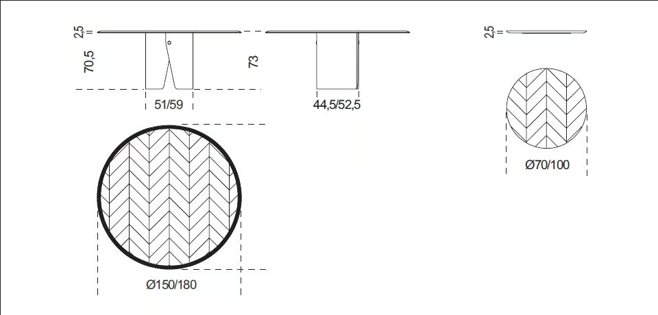 Der runde Holztisch MANTO von Gallotti&Radice ist ein atemberaubendes Zentrum für moderne Küchen. Mit einem einzigartigen Fischgrät-Einlegearbeit aus "Colore" Frisé-Walnuss ist dieser Tisch nicht nur eine funktionale Esslösung, sondern auch ein elegantes Kunstwerk. Mit einer 60 mm schwarzen Fase und einem geschwungenen Fuß, der durch einen hellen Messingknopf akzentuiert wird, kombiniert er Stil mit Praktikabilität und ist perfekt für Versammlungen und den täglichen Gebrauch.