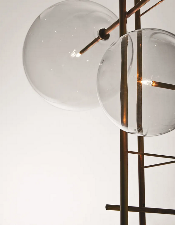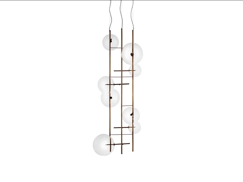 Diese Pendelleuchte besteht aus hochwertigen Materialien und präsentiert mundgeblasenes Glas, das sicherstellt, dass jede Kugel einzigartig und elegant gefertigt ist. Der Einsatz von Metall in Form von handpoliertem Messing verleiht einen luxuriösen Touch, verbessert die Haltbarkeit und fügt ein warmes, reflektierendes Element hinzu. Die Oberflächenbehandlung wird sorgfältig ausgeführt, um sowohl ästhetische Anziehungskraft als auch Langlebigkeit zu gewährleisten und internationale Umweltstandards für nachhaltige Materialien zu erfüllen.