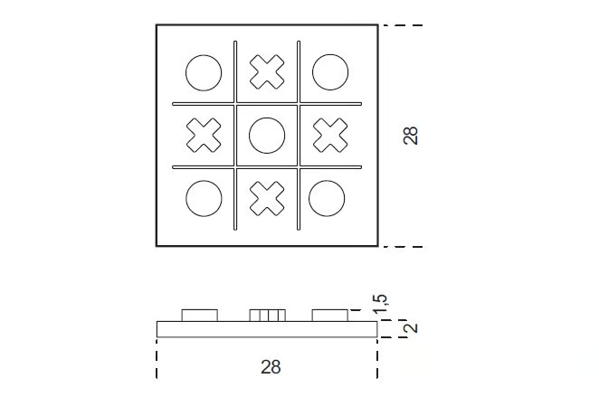 Das TIP TAP TOE-Spiel ist kompakt und vielseitig gestaltet, sodass es leicht in verschiedene Räume integriert werden kann. Seine Abmessungen sind sorgfältig durchdacht, um ein komfortables Spiel zu ermöglichen, während es nahtlos auf Tische unterschiedlicher Größe passt. Diese Aufmerksamkeit für Größe und Proportion stellt sicher, dass das Spiel sowohl für intime Zusammenkünfte als auch für größere gesellschaftliche Veranstaltungen geeignet ist, was es zur perfekten Wahl für jeden Anlass macht.