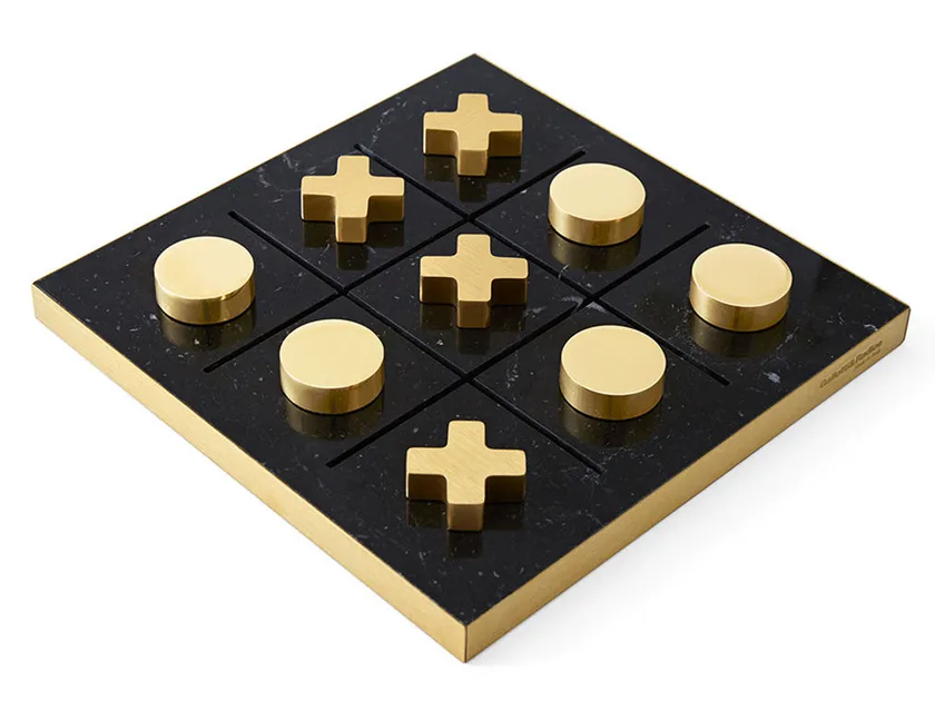 Das TIP TAP TOE-Spiel ist in einer auffälligen Kombination aus Schwarz und Gold erhältlich und wurde so entworfen, dass es mit verschiedenen Einrichtungsstilen harmoniert. Der tiefe schwarze Marmor bietet einen klassischen und eleganten Hintergrund, während die hellen Messingakzente einen zeitgemäßen Kontrast bieten. Diese Farbpalette wurde sorgfältig ausgewählt, um einen visuell ansprechenden und kohärenten Look zu schaffen, der sowohl moderne als auch traditionelle Räume ergänzt.
