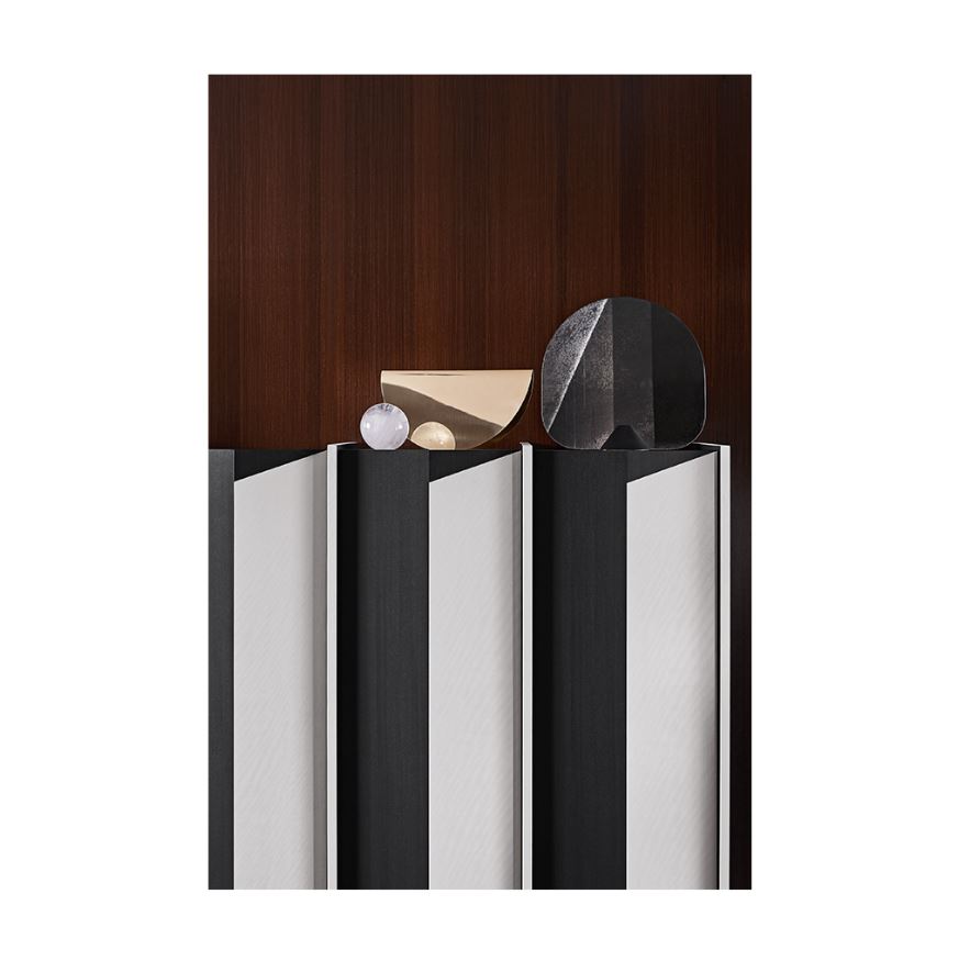 Das Design des DIEDRO-Hochschranks zeichnet sich durch sanfte Linien und eine raffinierte Silhouette aus, die die Schönheit der verwendeten Materialien hervorhebt. Mit seiner bronzierten, schwarzen Metallkonstruktion fügt sich die freistehende Version wunderbar in einen industriellen Touch ein, der wunderschön mit den Holzelementen kontrastiert. Die Liebe zum Detail zeigt sich in der sorgfältigen Auswahl der Oberflächen und der eleganten Integration von Glasregalen, die ein kohärentes Aussehen gewährleisten, das sowohl funktional als auch visuell ansprechend ist.