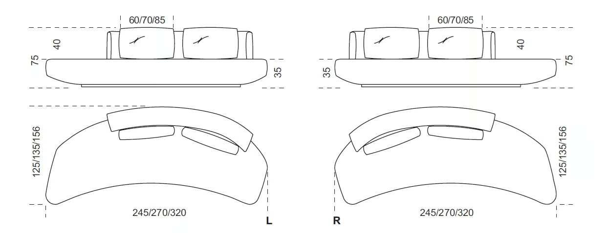 In verschiedenen Größen erhältlich, kann das Curved Fabric Sofa AUDREY an spezifische Anforderungen angepasst werden. Die Abmessungen wurden sorgfältig durchdacht, um maximalen Komfort zu bieten und gleichzeitig ein schlankes Profil zu bewahren. Dies macht es zu einer idealen Wahl für diejenigen, die ihren Wohnbereich optimieren möchten, ohne auf Stil oder Qualität zu verzichten.
