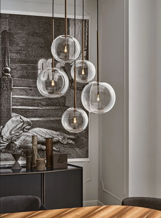 Diese Pendelleuchte verkörpert einen modernen Stil und zeigt eine einzigartige Mischung aus zeitgenössischen und klassischen Designelementen. Die klaren Linien der Glassphäre, kombiniert mit den eleganten Messingakzenten, erzeugen einen auffälligen visuellen Effekt, der jedes Interieur aufwertet. Ihr minimalistisches und elegantes Design macht sie zu einer vielseitigen Ergänzung für verschiedene Umgebungen, von Wohnräumen bis hin zu gewerblichen Räumen.
