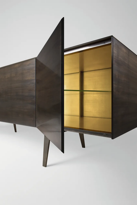 Dieser Sideboard verkörpert einen modernen Stil, der durch klare Linien und einen minimalistischen Ansatz gekennzeichnet ist, der die künstlerischen Elemente hervorhebt. Das Design vereint traditionelle Handwerkskunst mit zeitgenössischer Ästhetik, was zu einem visuell auffälligen Stück führt, das in jeder Umgebung herausragt. Sein schlankes Profil und die eleganten Oberflächen machen es zu einer zeitlosen Ergänzung für jeden Raum.