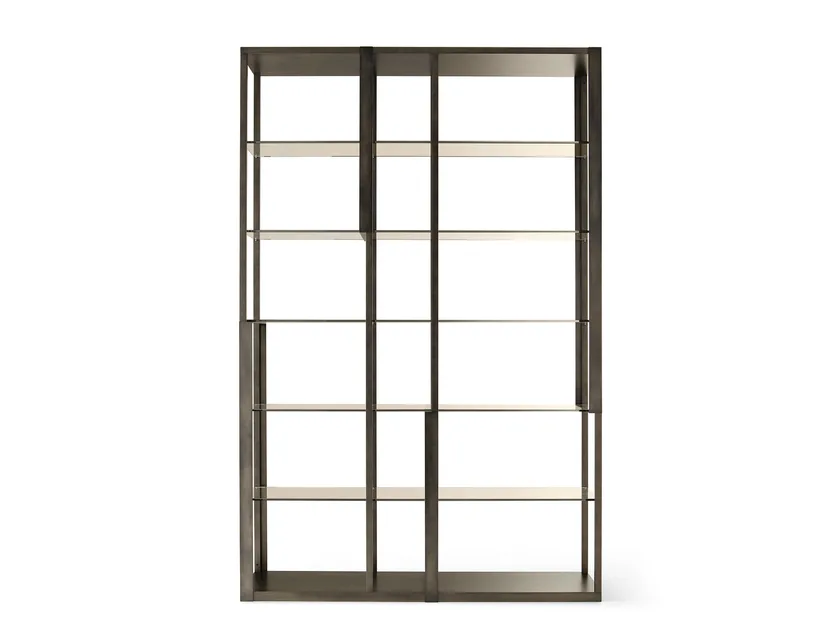 Das Open Freestanding Bookcase integriert innovative Designlösungen, die seine Benutzerfreundlichkeit verbessern. Die Verwendung von gehärtetem Glas sorgt für Sicherheit und Langlebigkeit, während der bronzefarbene lackierte Metallrahmen auf Langlebigkeit behandelt wird. Diese fortschrittlichen Materialien und Bauweisen verleihen dem Bücherregal einen modernen Touch und stellen sicher, dass es ein zeitloses Stück in Ihrer Sammlung bleibt.