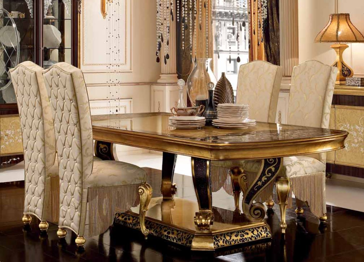 Stuhl ohne Armlehnen mit gepolstertem Sitz und hoher Rückenlehne wird von der Fabrik & amp;nbsp;A. R. ARREDAMENTI SRL in der ROYAL PALACE Kollektion präsentiert. Die Außenseite der Rückenlehne des Stuhls bis zum selbst unten ist mit Stoff gepolstert, & amp;nbsp; mit Capton-Stich bestickt und mit Fransen verziert.&Amp;nbsp;seine Gebogenen Beine & amp;nbsp; sind mit handgefertigten kunstschnitzereien dekoriert. Der Stuhl ist aus massivem Naturholz, Polsterung ist Stoff, Füllung ist Polyurethan. Erhältlich bestellen Stuhl mit Armlehnen