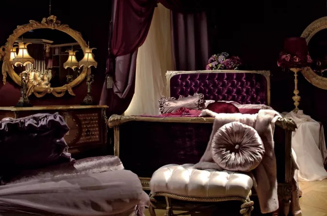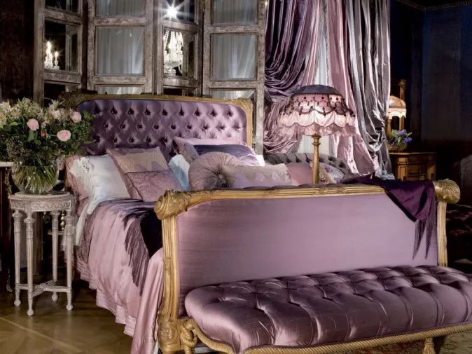 Doppelbett, hohes, weiches Kopfteil, ohne Fuß. Dekoriert mit Schnitzereien. Es sind andere Varianten der Ausstattung und der Polsterung möglich.