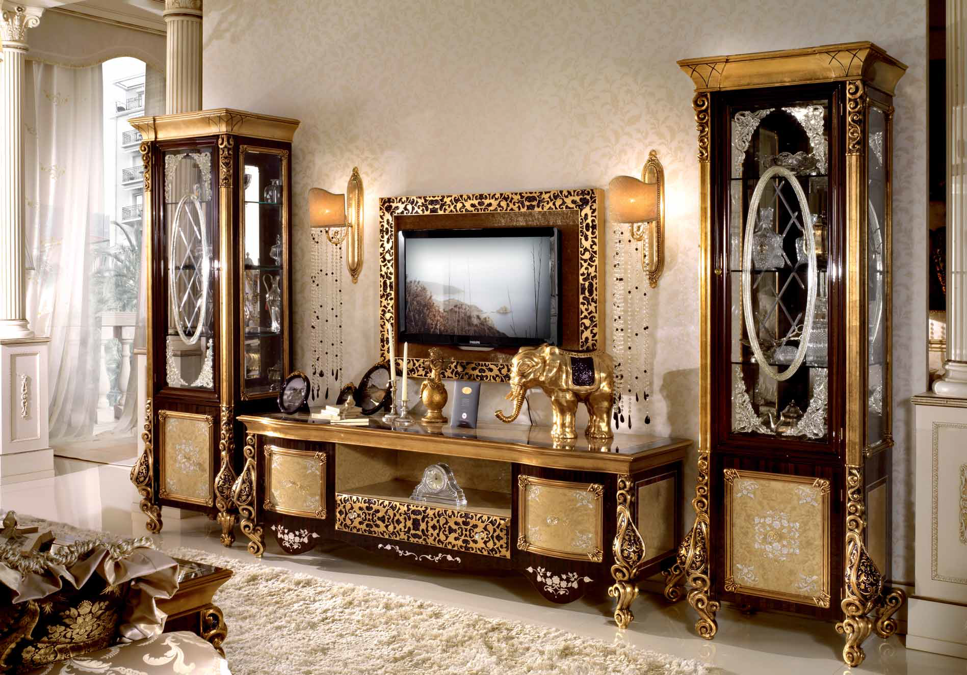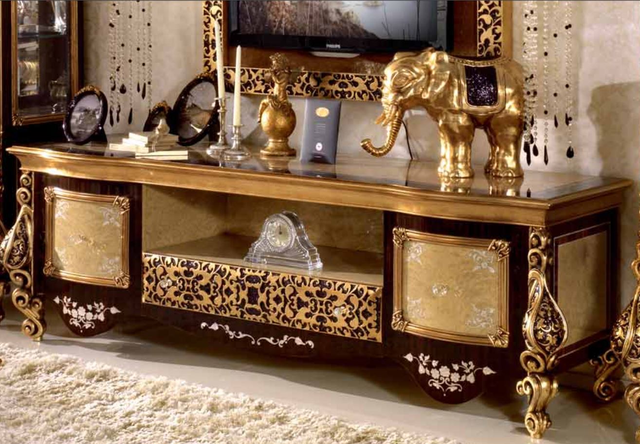 Der TV-Schrank mit luxuriösen geschnitzten Oberflächen wird von der Fabrik A. R. ARREDAMENTI SRL in der Sammlung & amp;nbsp; ROYAL PALACE präsentiert. Der Schrank ist im klassischen Stil, ausgestattet mit zwei Türen, zwei Schubladen und einer zentralen Nische. Hergestellt aus massivem Naturholz, dekoriert mit Intarsien und handgefertigte kunstschnitzereien
