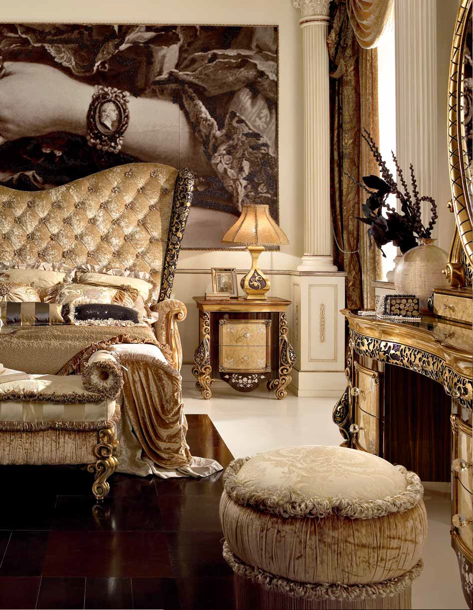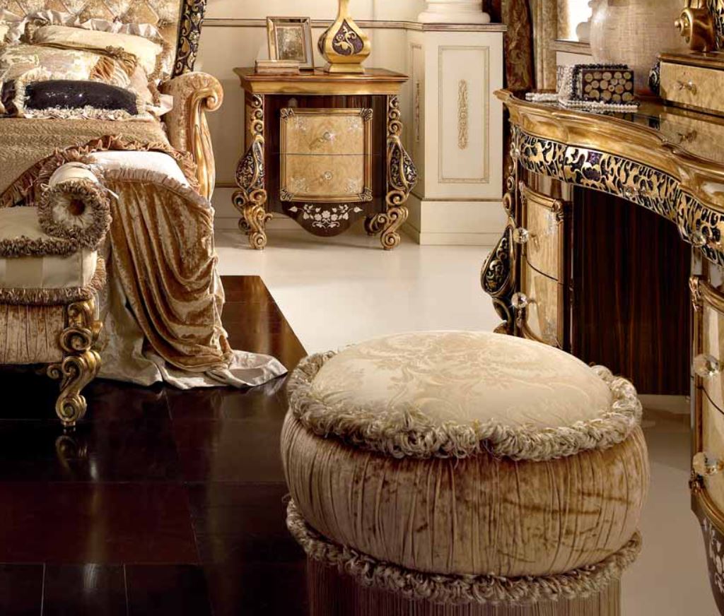 Der im klassischen Stil gestaltete Runde Hocker wird von der Fabrik A. R. ARREDAMENTI SRL in der ROYAL PALACE Kollektion präsentiert. Der Hocker ist mit Stoff  gepolstert und ist mit barchrome  dekoriert