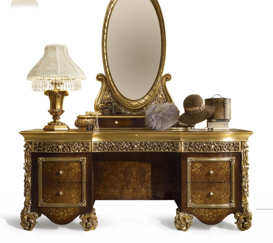 Ein klassischer Schminktisch, der von der Fabrik A. R. ARREDAMENTI SRL in der CELEBRITY Kollektion präsentiert wird. Der Tisch ist mit sieben Schubladen& ausgestattet; nbsp;und ist aus massivem Naturholz. Dekoriert mit & amp;nbsp; Inlay und handgefertigte Kunst Schnitzereien