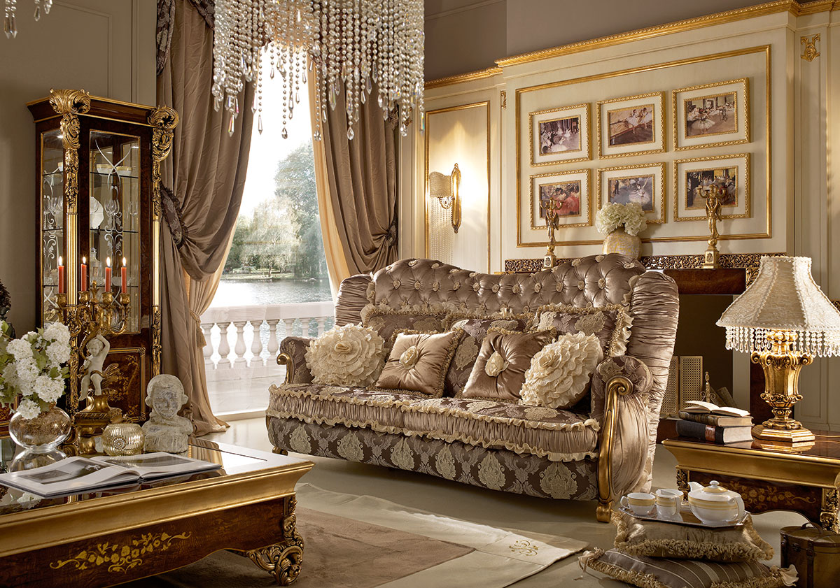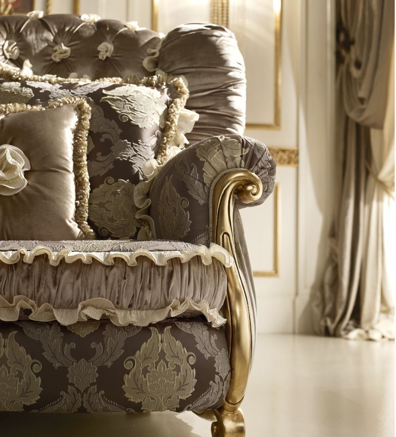 Dreibettzimmer Sofa mit weichen Armlehnen, dekoriert mit handgefertigten kunstschnitzereien präsentiert von der Fabrik A. R. ARREDAMENTI SRL & amp;nbsp; in der CELEBRITY Collection. Das Sofa ist mit Kissen ausgestattet, seine Rückenlehne mit kapitone-Stich bestickt.& amp;nbsp; der Rahmen des Sofas ist aus massivem Naturholz, die Polsterung ist Stoff, die Füllung ist Polyurethan. Es ist die Bestellung des Erzeugnisses ohne Satz der Kissen Verfgbar