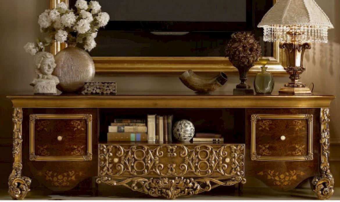 TV-Kommode mit einem luxuriösen geschnitzten Finish & amp;nbsp; präsentiert von der Fabrik A. R. ARREDAMENTI SRL & amp;nbsp; in der Kollektion CELEBRITY. Der Schrank ist im klassischen Stil, ausgestattet mit zwei Türen, einem ausziehbaren Schublade und einer zentralen Nische. Hergestellt aus massivem Naturholz, dekoriert mit Intarsien und handgefertigte kunstschnitzereien