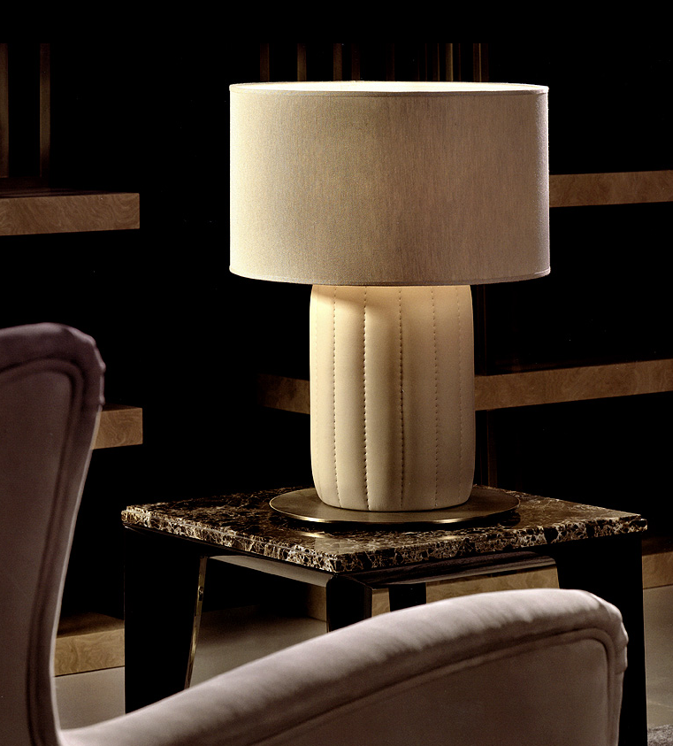 Die Tischlampe wird im Art-Deco-Stil von der italienischen Fabrik SIGNORINI COCO&C, der Daytona-Kollektion, präsentiert. Leder gepolstert, Basis aus Messing, Lampenschirm aus Stoff.