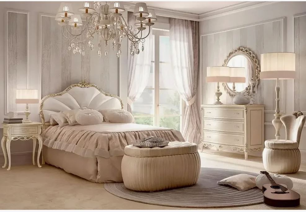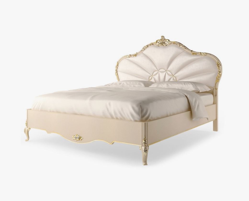 Doppelbett mit einem hohen weichen Kopfteil, präsentiert im klassischen Stil der italienischen Fabrik SIGNORINI COCO & amp;C, Kollektion Forever. Aus Massivholz, dekoriert mit Schnitzereien. Das Kopfteil ist mit Stoff gepolstert. Es sind andere Varianten der Ausstattung und der Polsterung möglich.