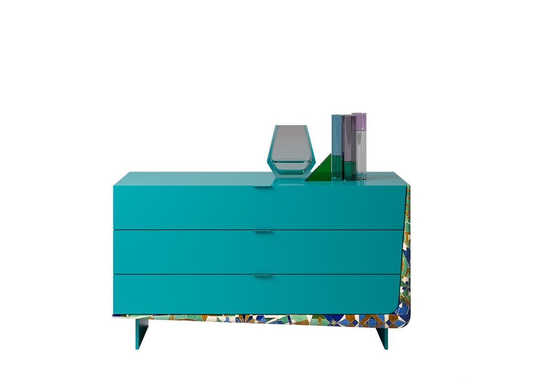 Entwicklung der SIGNORINI COCO-Fabrik. Kommode BOOMERANG Fabrik DAYTONA Kollektion WONDERLAND. Der Rahmen und die Schubladen bestehen aus Sperrholz, das mit lackiertem MDF beschichtet ist. Schubladenverzierung, Griffe aus lackiertem Stahl.